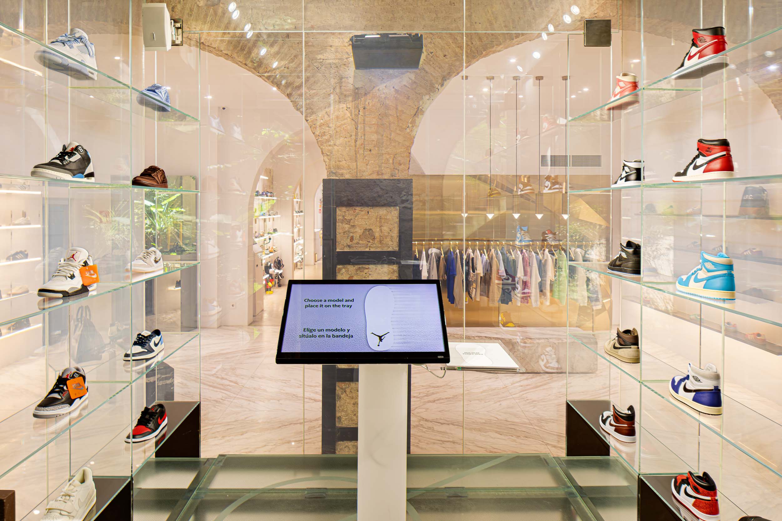 Um cubo de vidro de 3x3 metros, conhecido pelos clientes como “Jordan Cube”, presta homenagem a MJ na FOOTDISTRICT BARCELONA.
